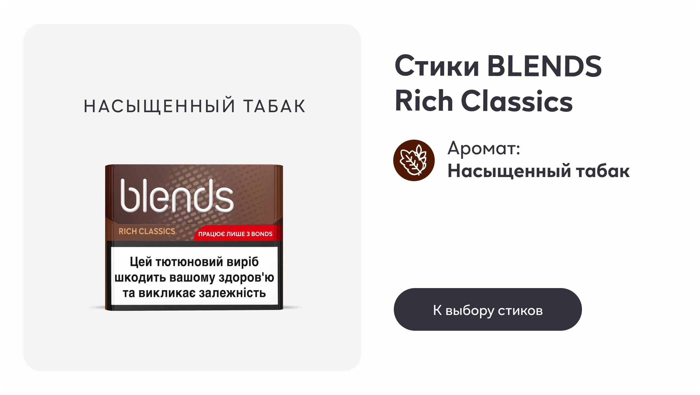 Стики с табачными ароматами (TEREA Amber, DELIA Classic Gold, HEETS Bronze, BLENDS Warm Classics и др.) скорее всего подойдут тем, кто до перехода на Айкос курил обычные неароматизированные сигареты без капсул или электронные сигареты с табачными вкусами. Они различаются между собой крепостью и вкусовыми нотами, поэтому среди них можно найти замену сигаретам.