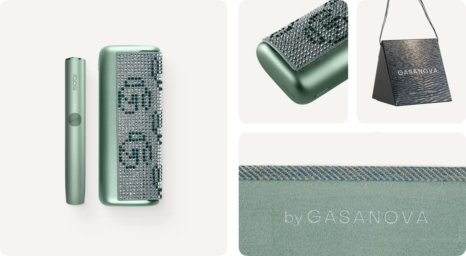 IQOS ILUMA PRIME, IQOS x GASANOVA Отблеск: основной материал крышки-накладки — премиальные стеклянные кристаллы, переливающиеся на солнце серебристым и зелёным оттенками.
