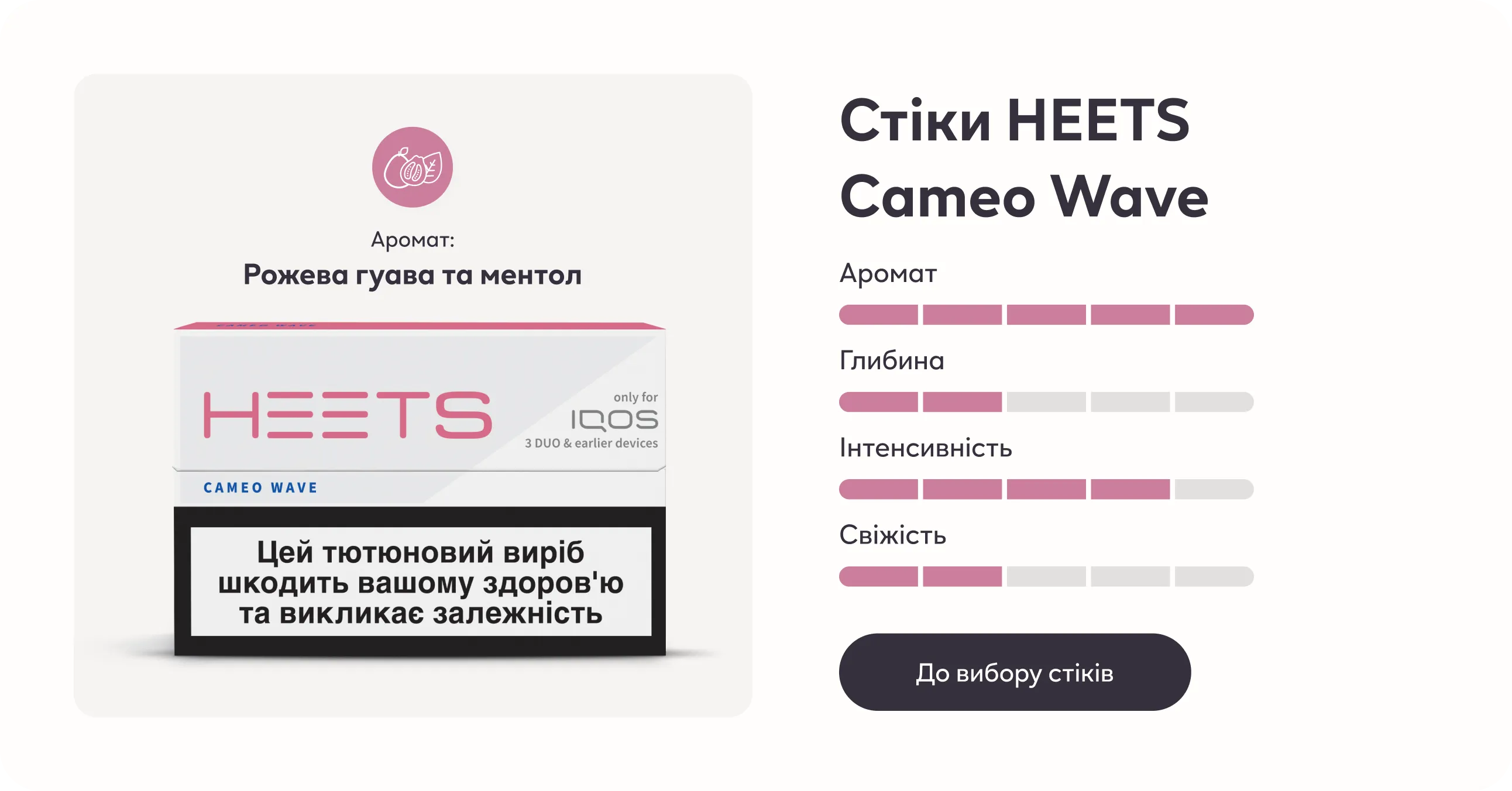 HEETS Cameo Wave (Хітс Камео Вейв) – рожева гуава та ментол у ароматі тютюнового аерозолю.