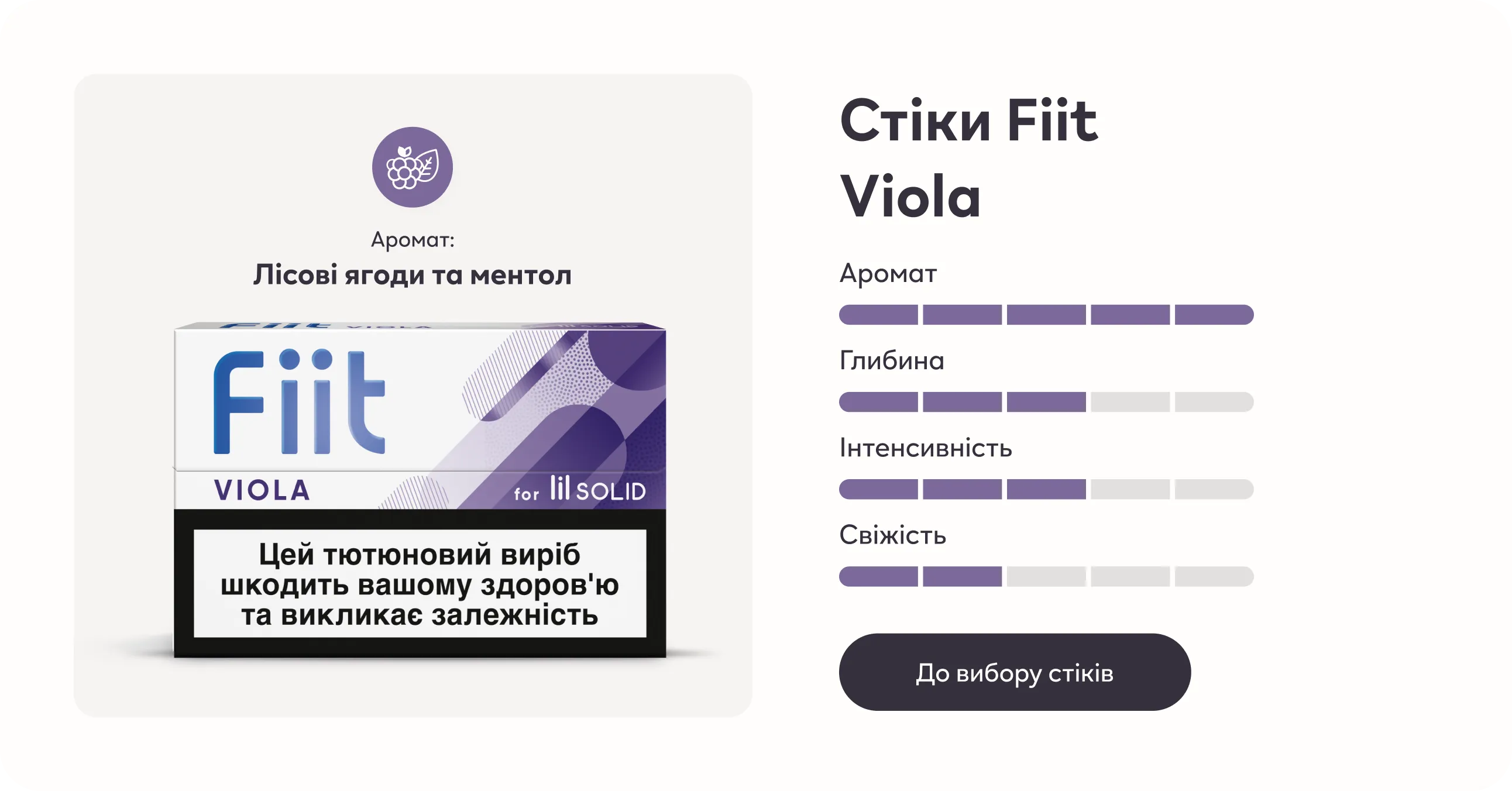 Fiit Viola (Фіт Віола) — ожина та ментол у ароматі тютюнового аерозолю.