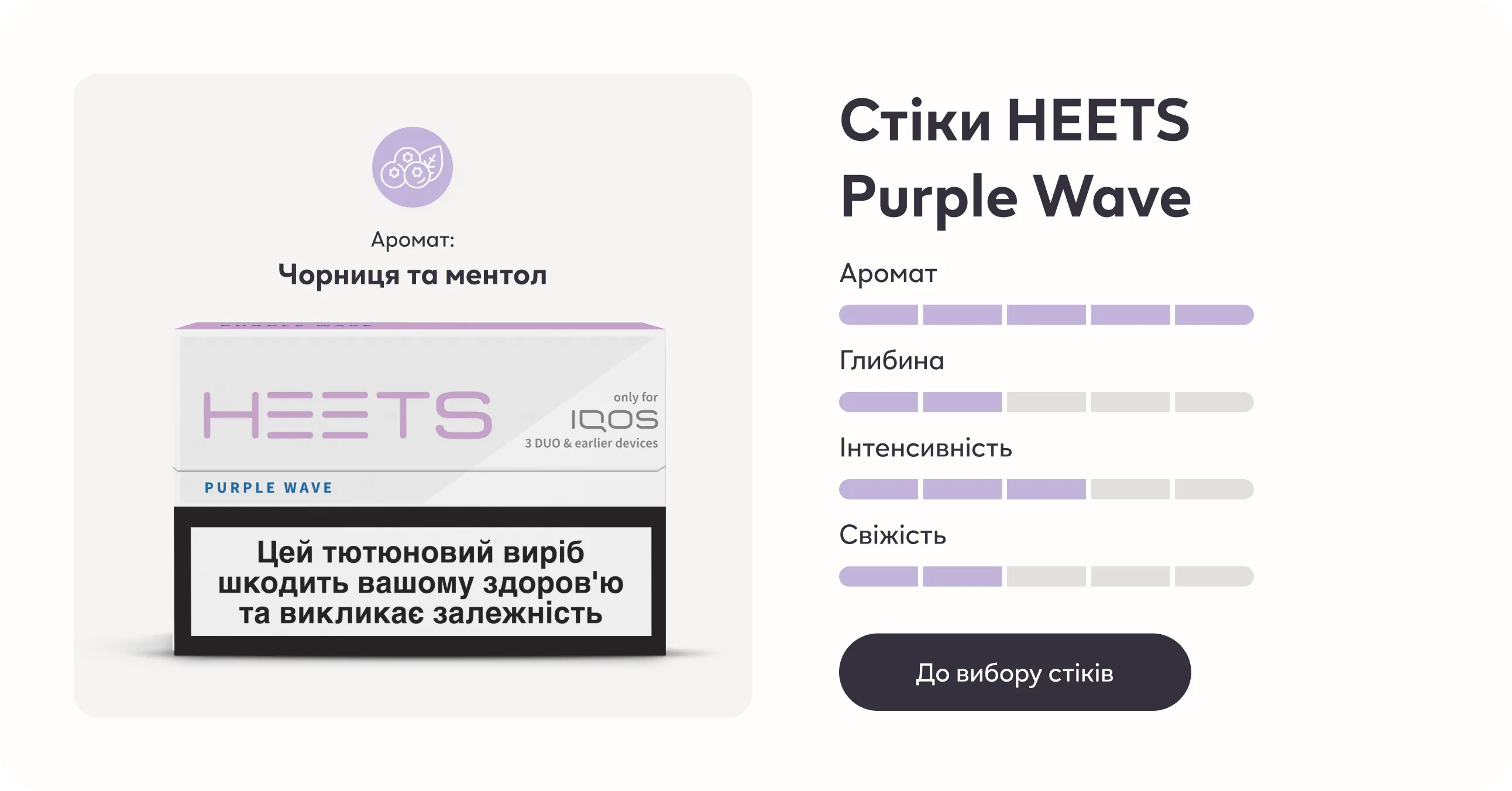 HEETS Purple Wave (Хітс Пьорпл Вейв) – мають освіжаючий смак чорниці з нотками ментолу в ароматі тютюнового аерозолю.
