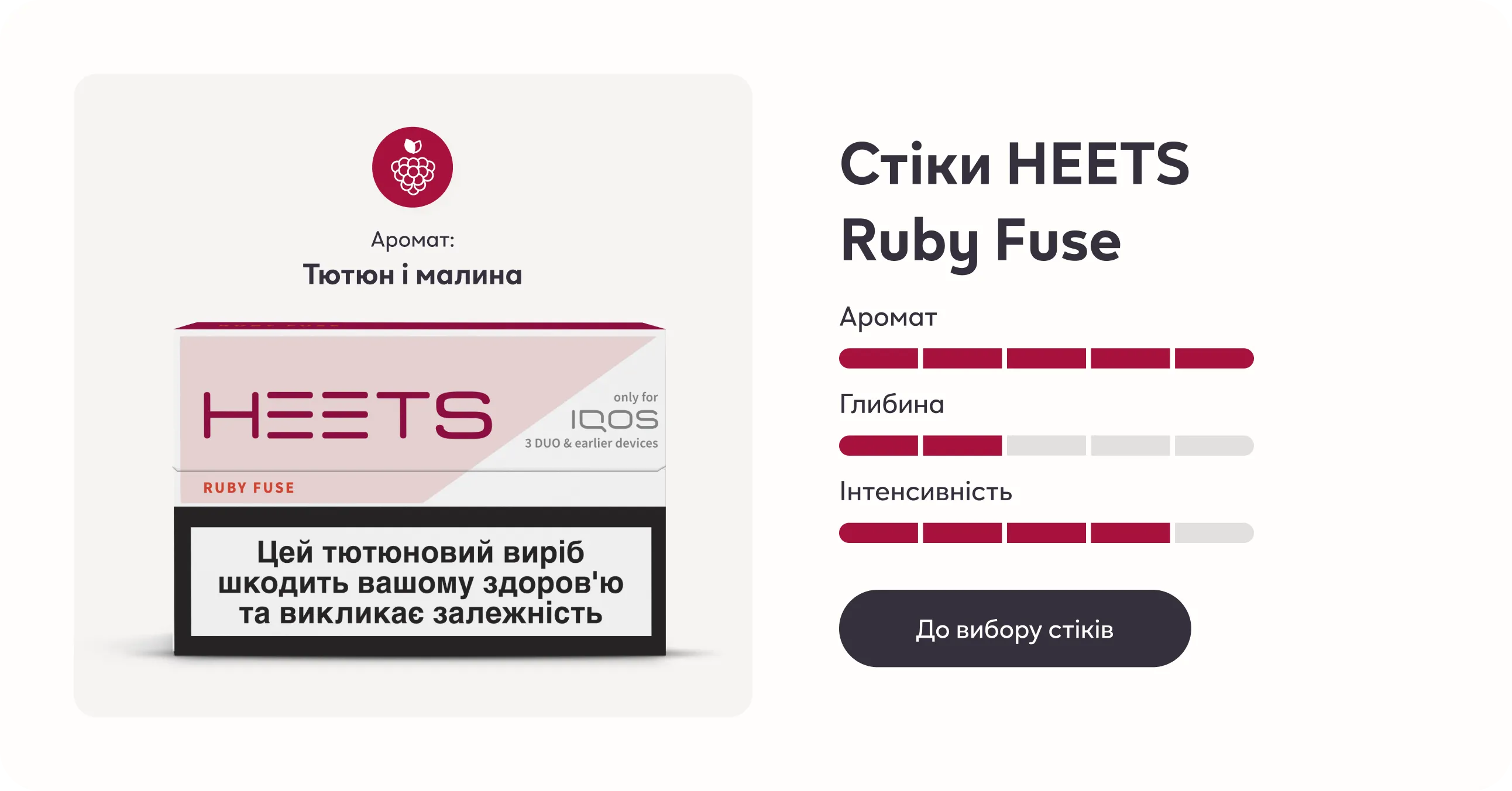 HEETS Ruby Fuse (Рубі Фьюз) — мають смак малини з квітковими нотками у ароматі тютюнового аерозолю.