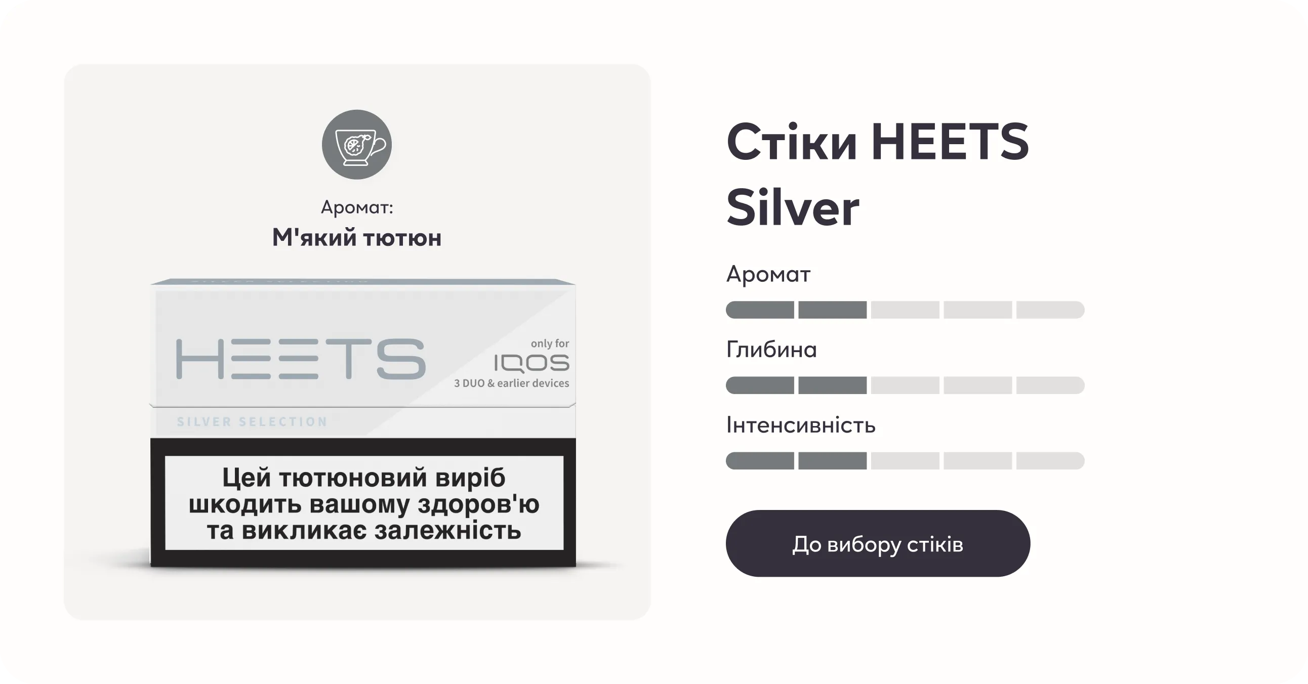 Стіки Silver мають м’який аромат, досить нейтральний, майже невідчутний при використанні. Зазвичай стіки обирають користувачі, які тільки нещодавно перейшли зі звичайних сигарет на IQOS.