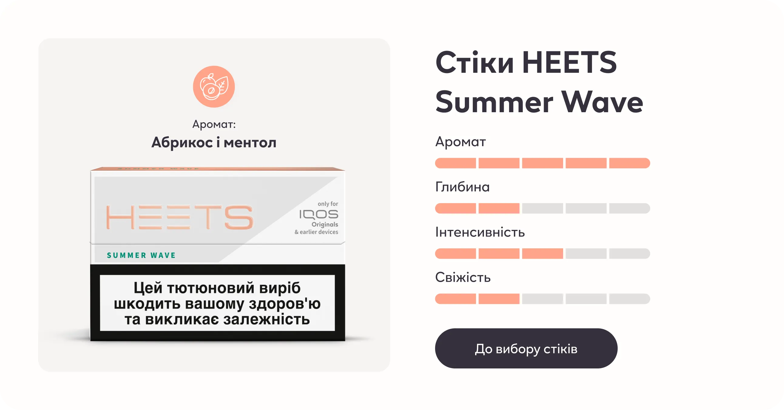 HEETS Summer Wave (Самер Вейв) – абрикос та ментол з квітковими нотками у ароматі тютюнового аерозолю.