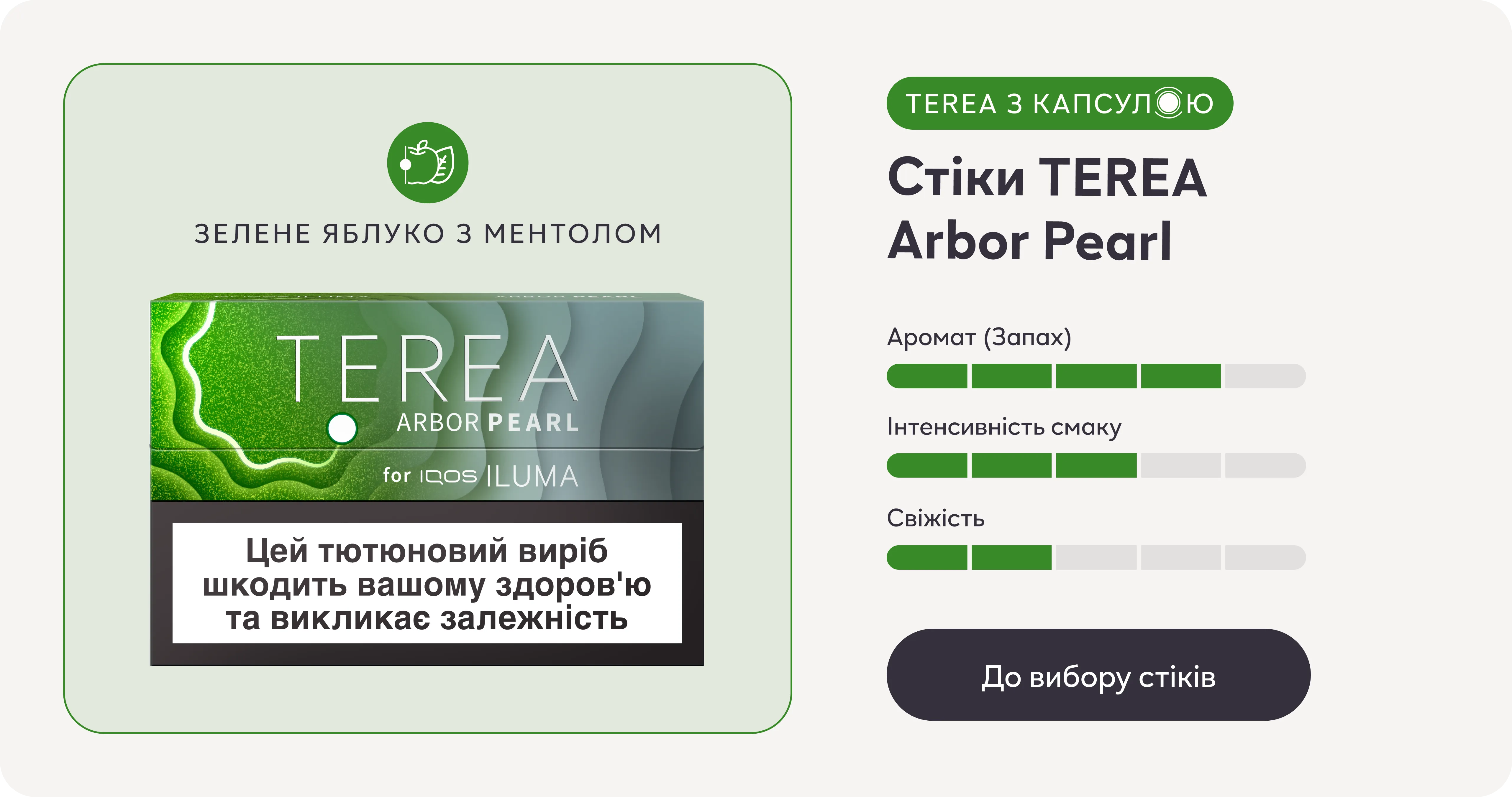 TEREA Arbor Pearl (Тереа Арбор Пьорл) — свіжий аромат зеленого яблука, поєднаний з ментолом у тютюновому аерозолі.