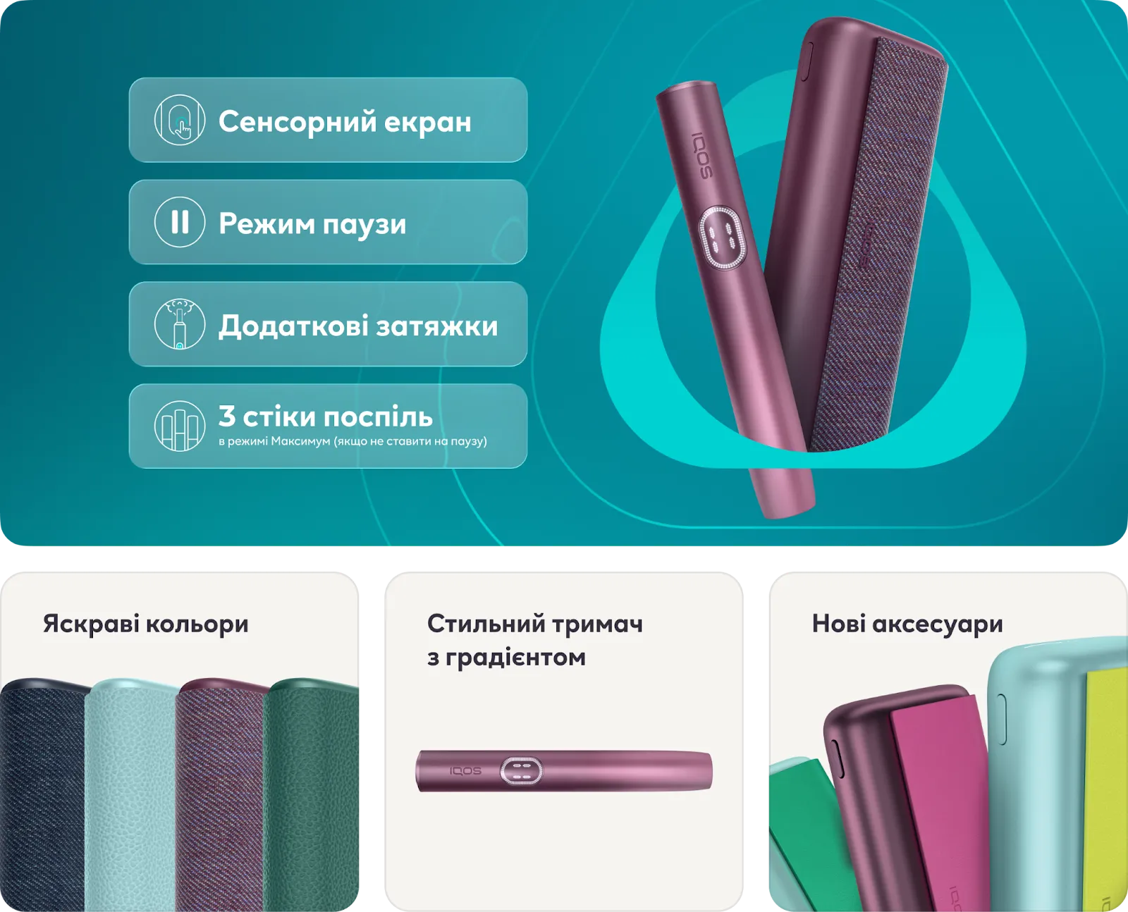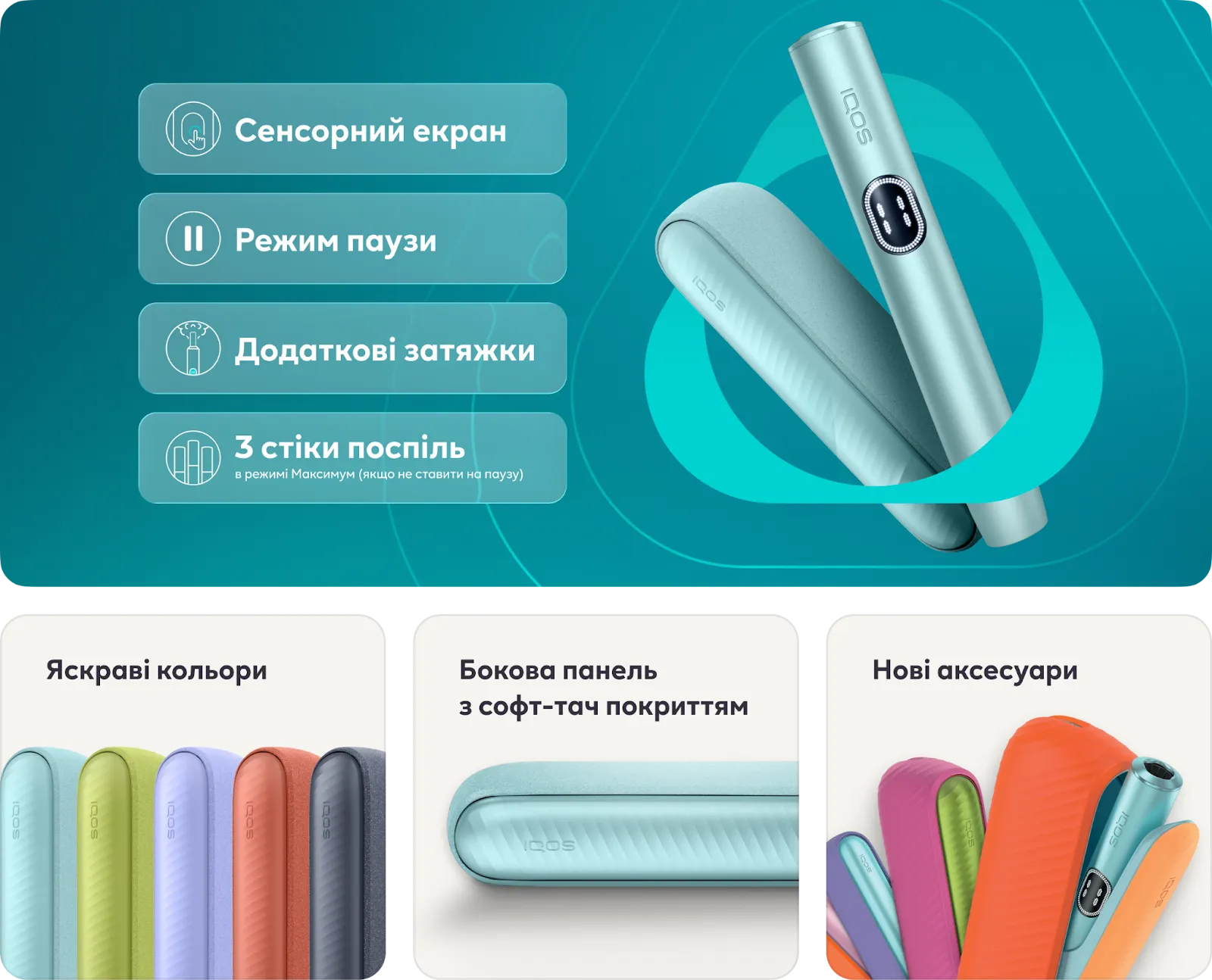 Режим паузи — IQOS ILUMA i та IQOS ILUMA i PRIME. Нова функція, яка дозволяє призупинити сеанс на 8 хвилин. Доступна перші три хвилини сеансу або перші 8 затяжок. Якщо сеанс не відновити, він просто завершиться. Щоб увімкнути, достатньо провести пальцем по екрану вниз, щоб вимкнути — вверх. Індикатори на екрані підкажуть, скільки часу залишилося до кінця паузи.